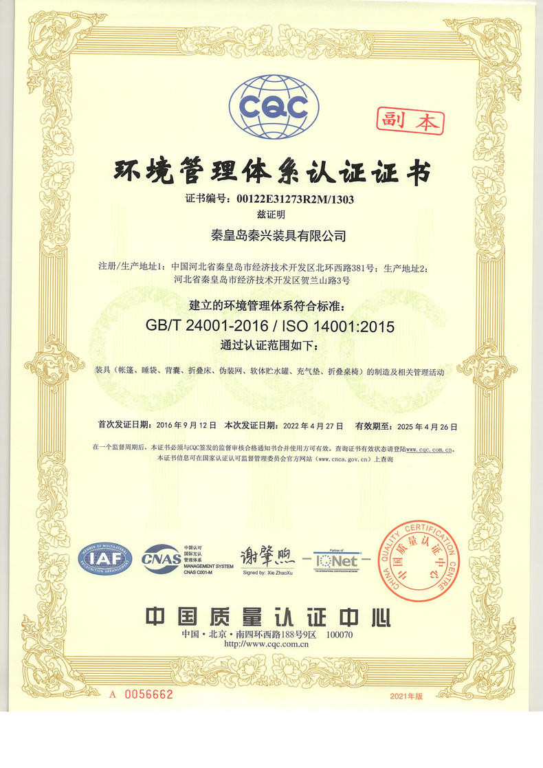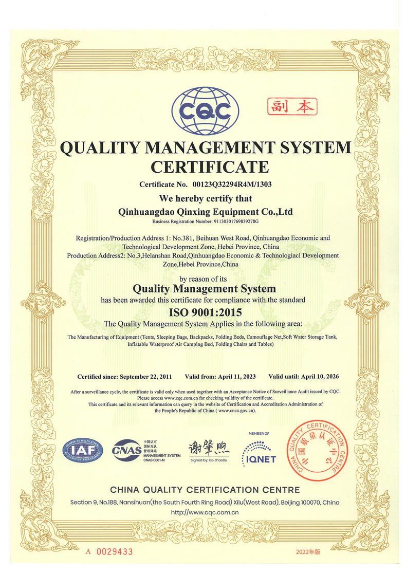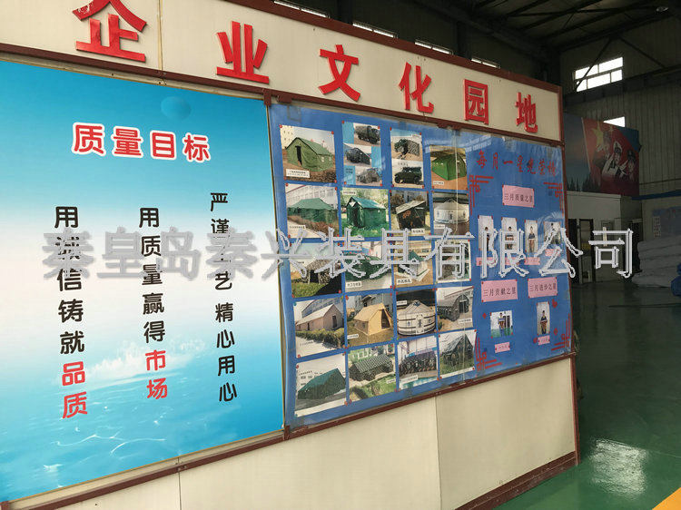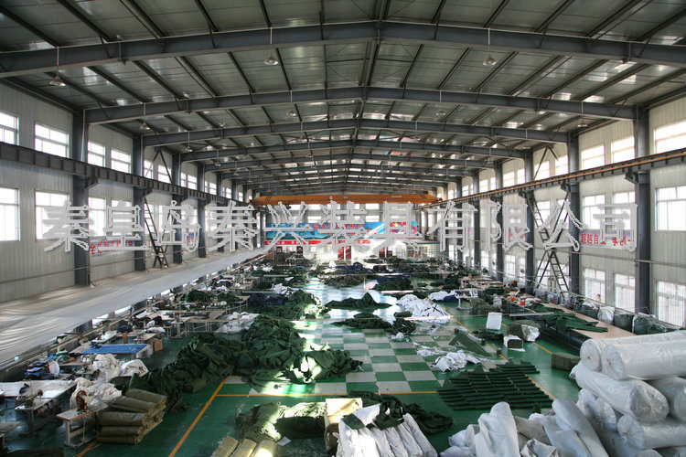 秦皇島秦興裝具有限公司有限公司源于我國第3524工廠,創(chuàng)建于2005年,占地面積30畝,是一家致力于研究,發(fā)展,制造和銷售為一體的綜合性裝具及紡織服裝加工生產(chǎn)企業(yè),我們的主要產(chǎn)品有單、棉帳篷,民用帳篷,旅游帳篷集各種機工產(chǎn)品等。
